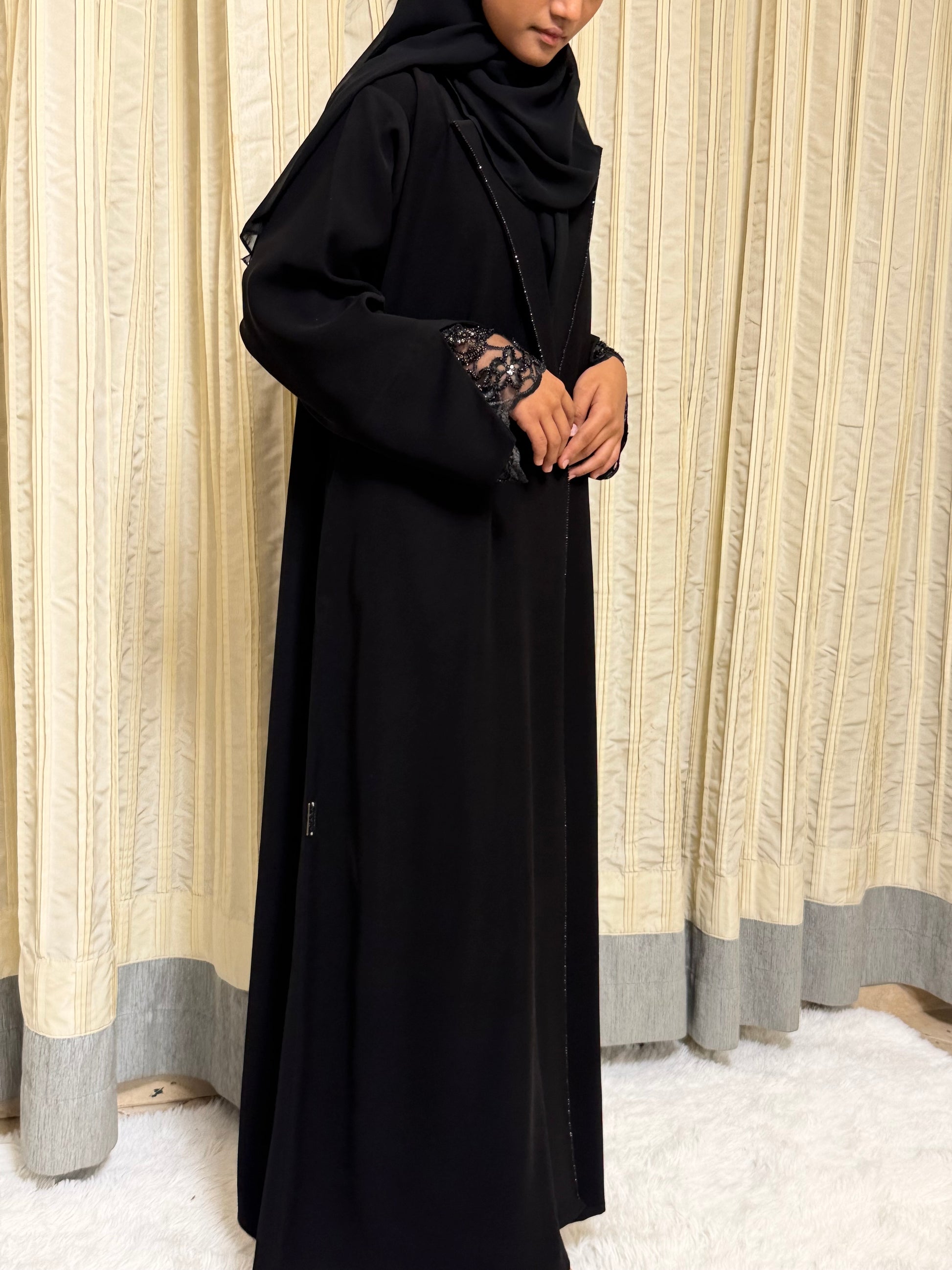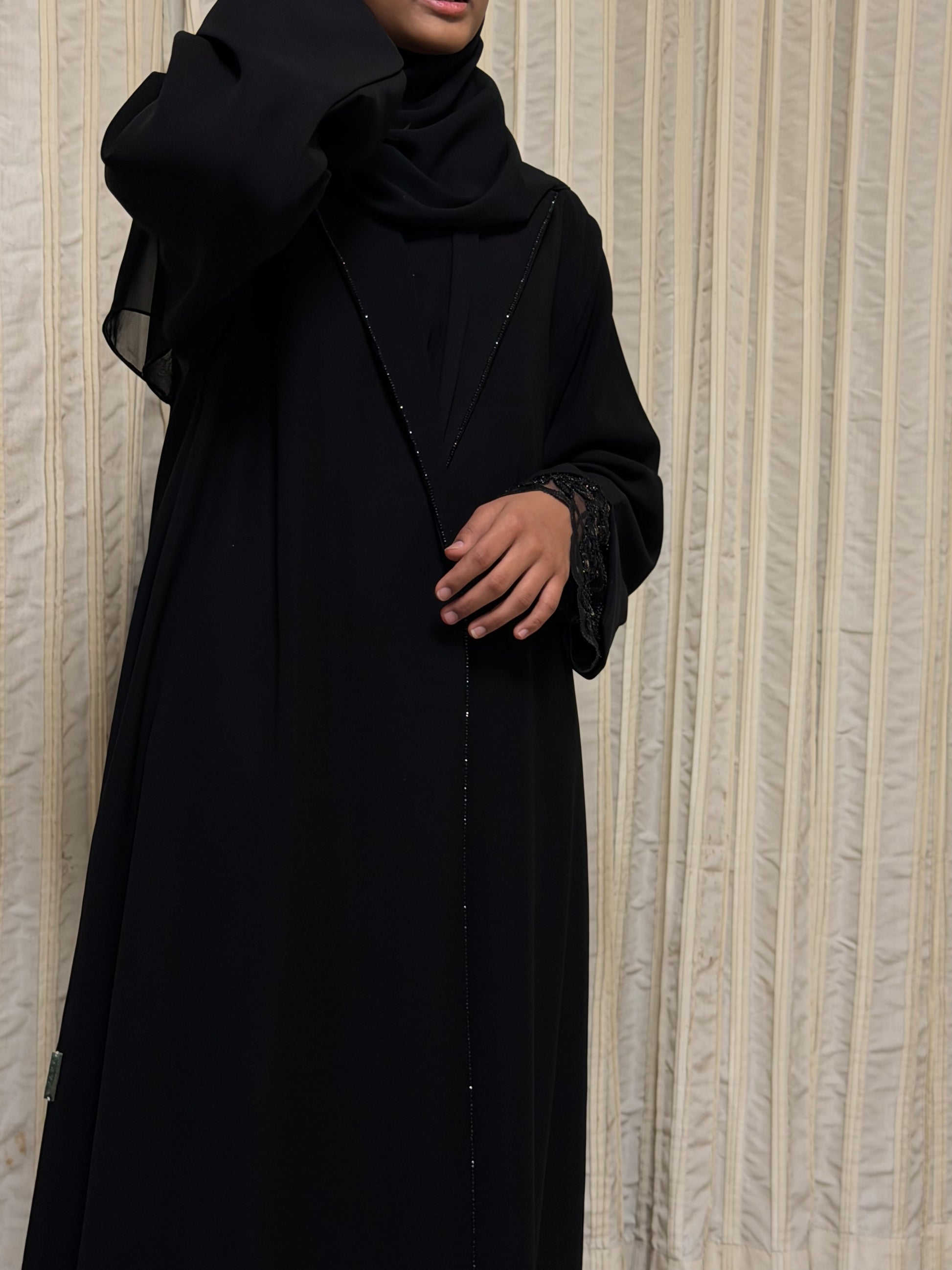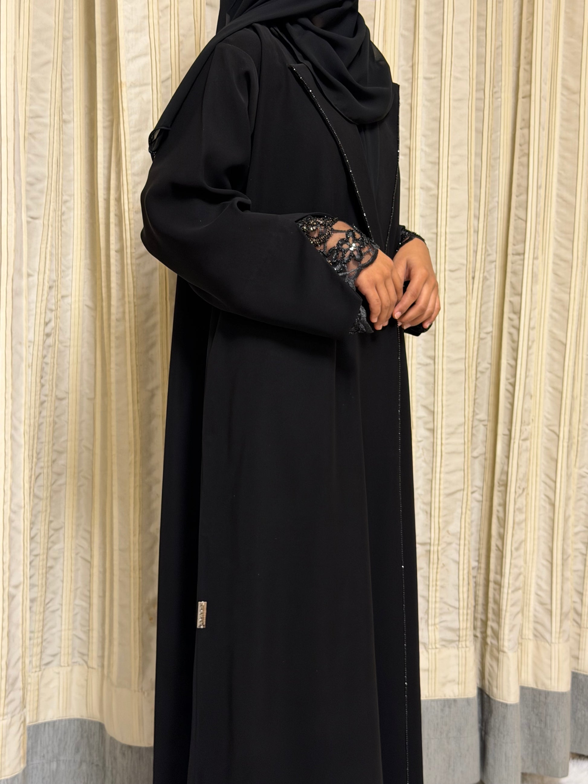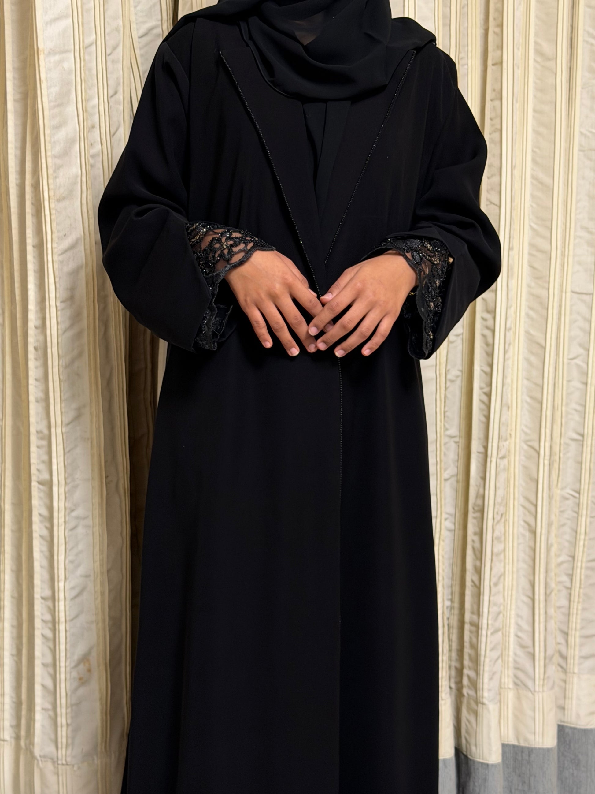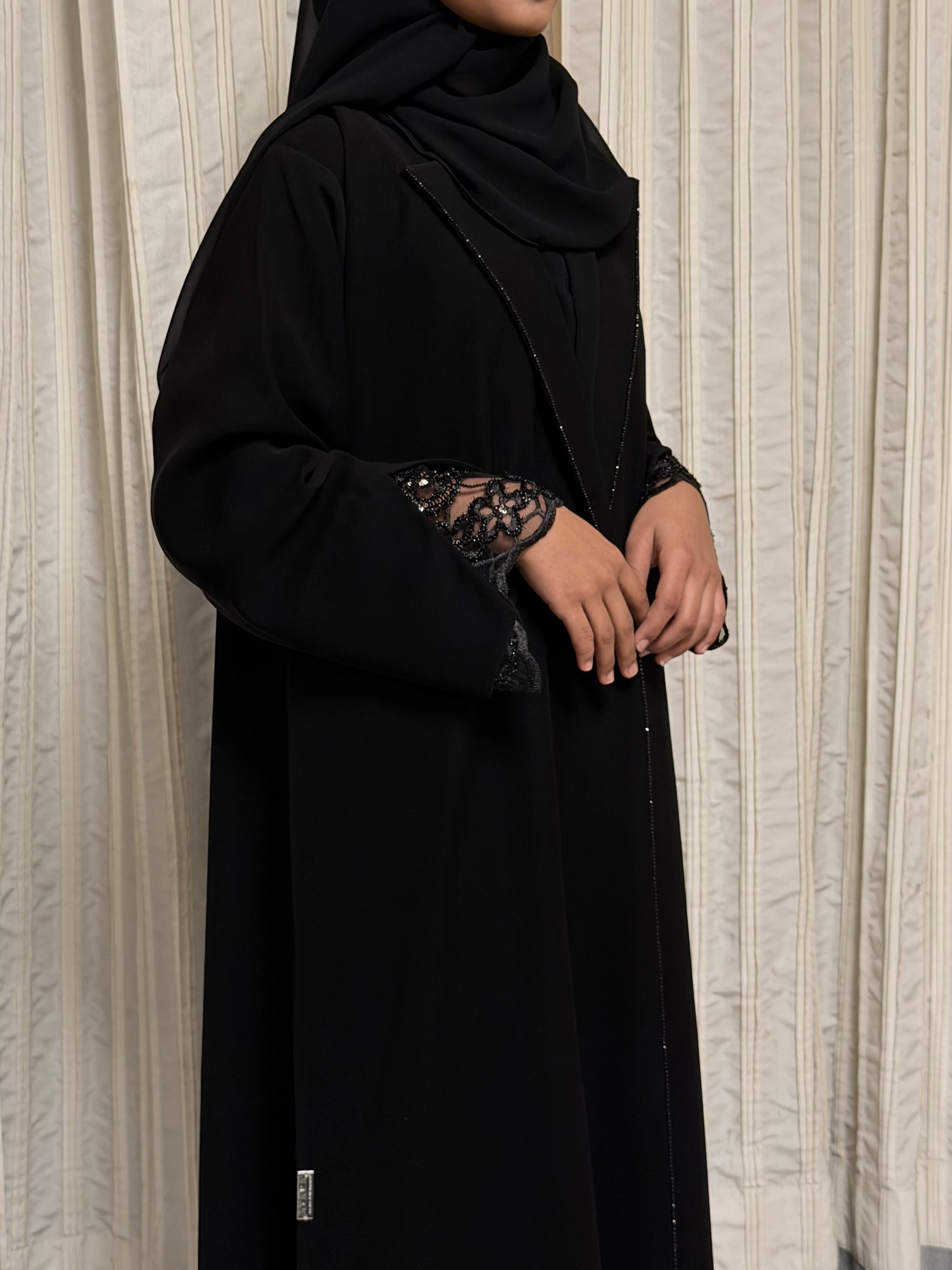 Crafted from a premium crepe blend, Elyra offers a smooth, fluid drape with a soft matte finish. The design is elevated with delicate lace detailing on the sleeves and subtle stone embellishment along the collar, adding refined elegance without overpowering the silhouette. Comfortable, graceful, and effortlessly polished.