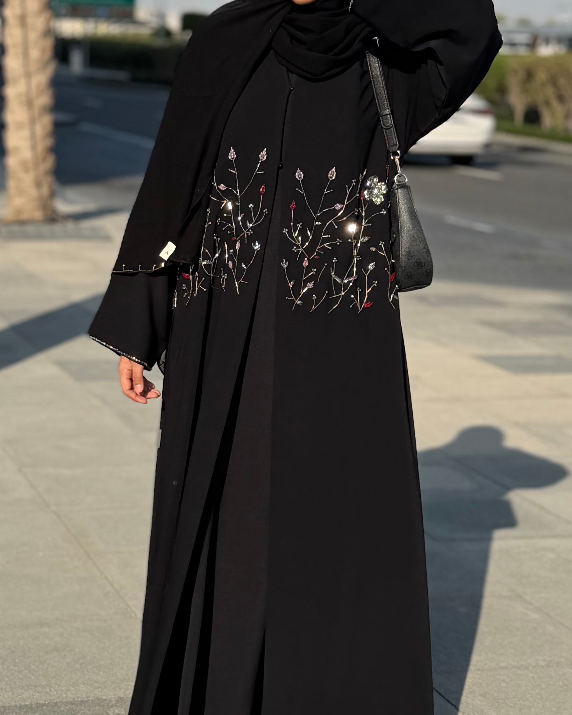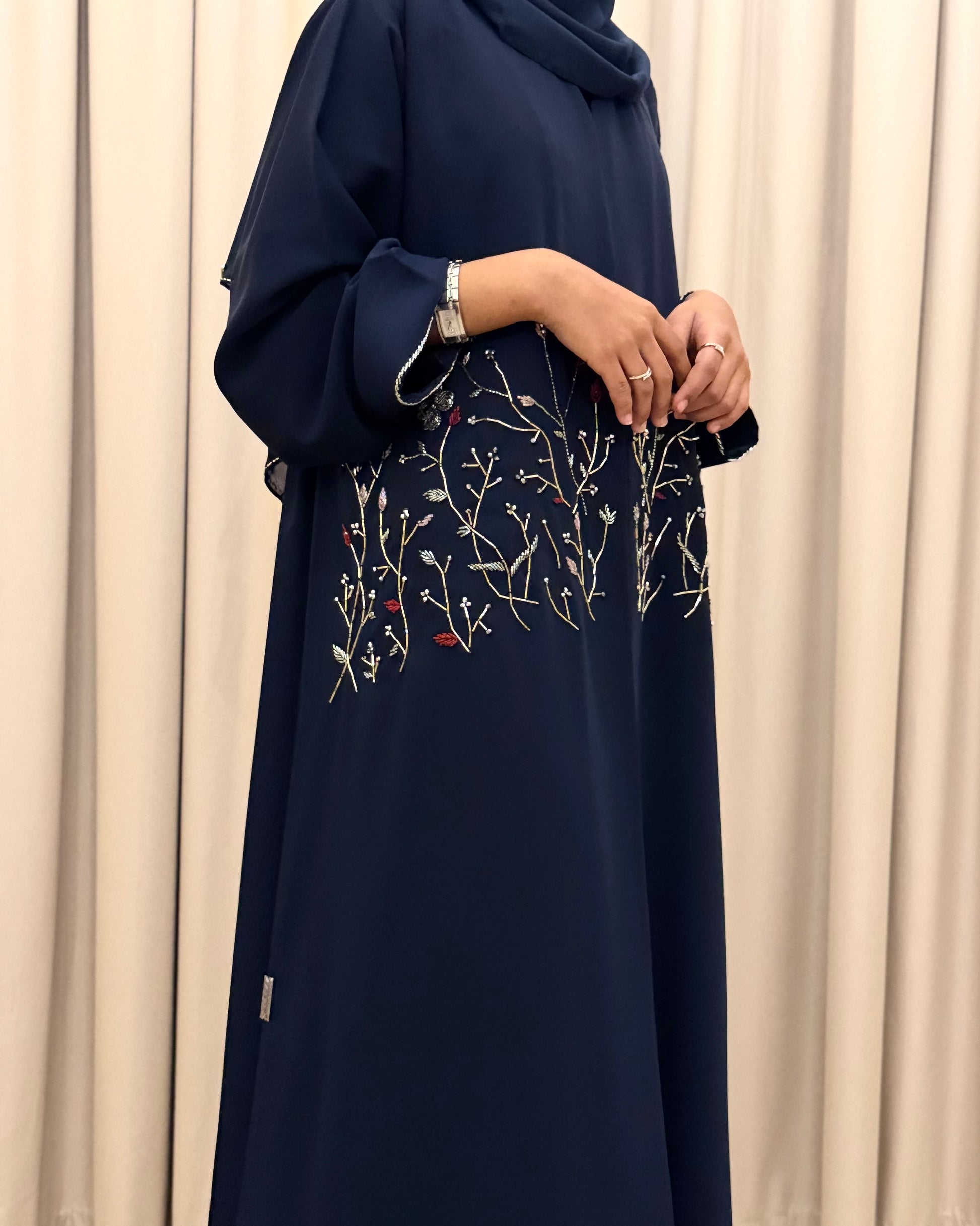 Fine branch embroidery across the chest in muted tones. Available in black and deep navy. Elegant sister-style concept.