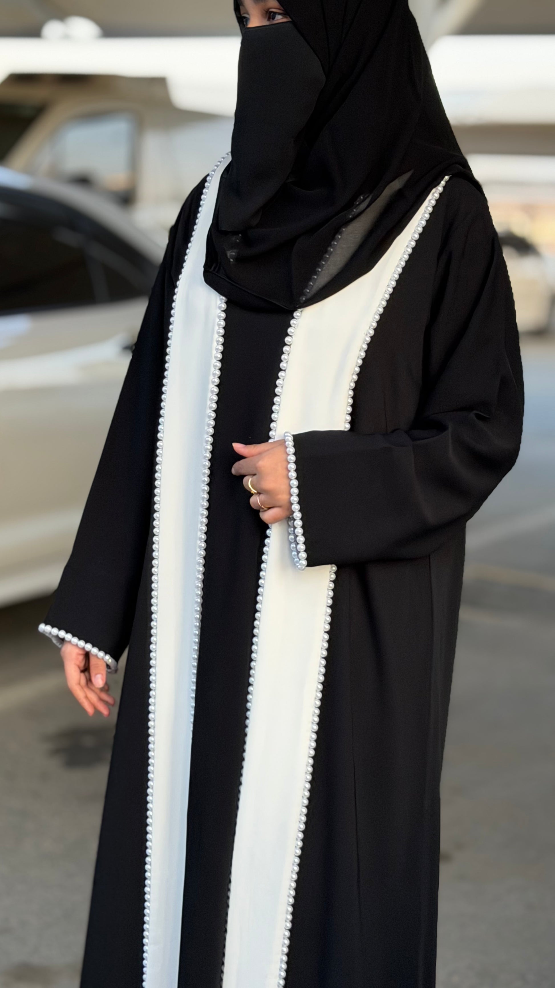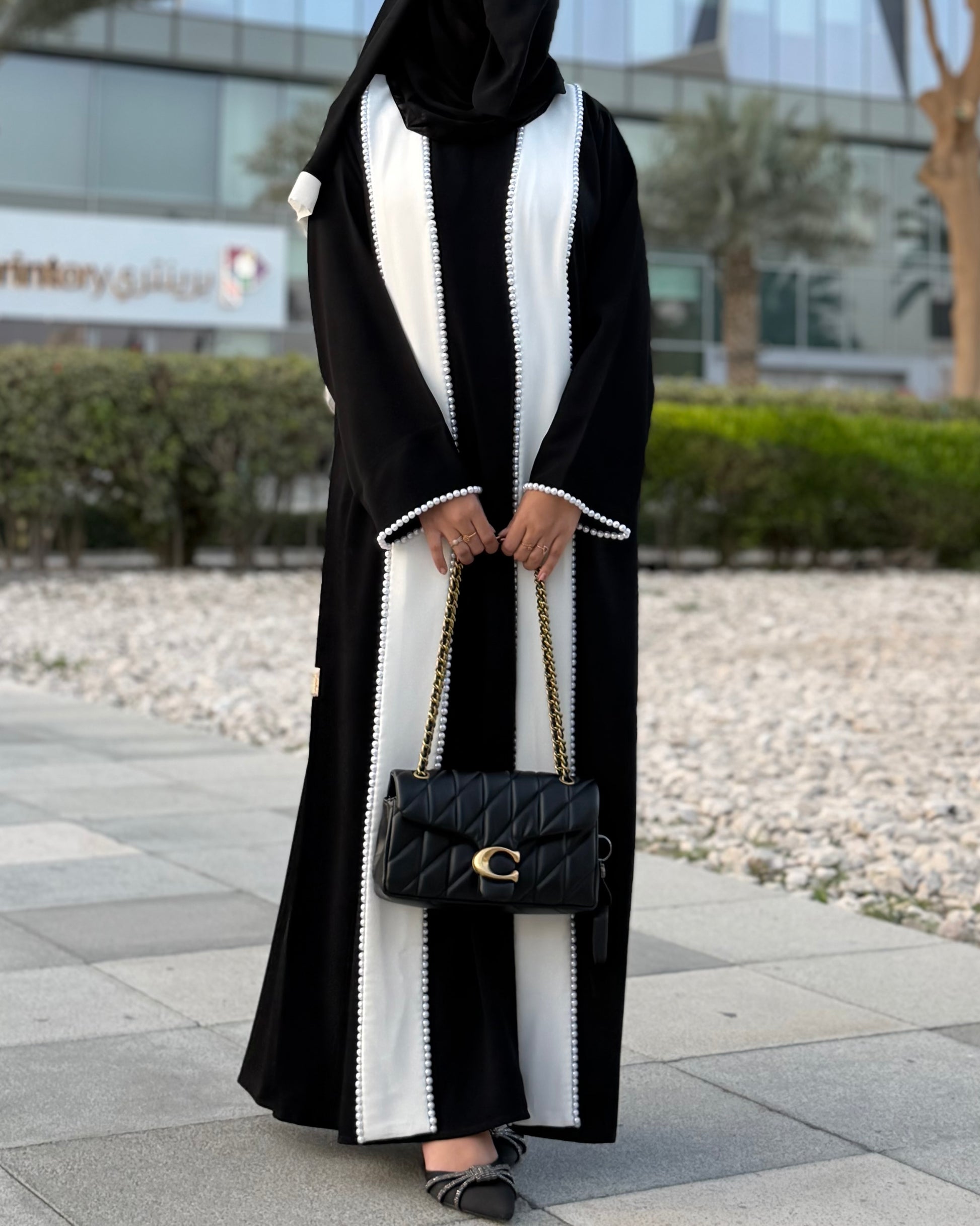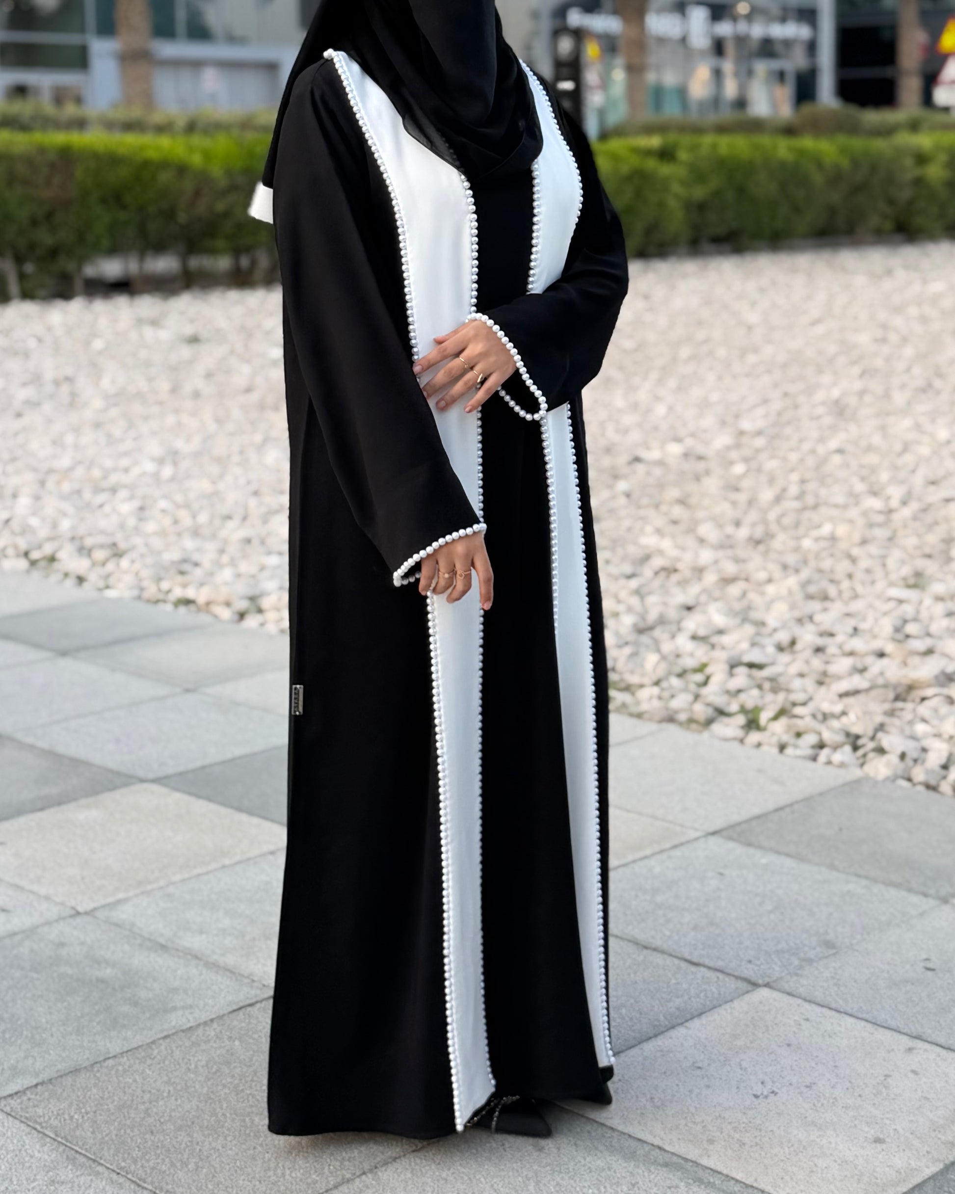 Refined pearl trimming along the front opening and sleeve cuffs. Designed with a vertical contrast panel that elongates the silhouette and adds understated elegance without heavy embellishment.