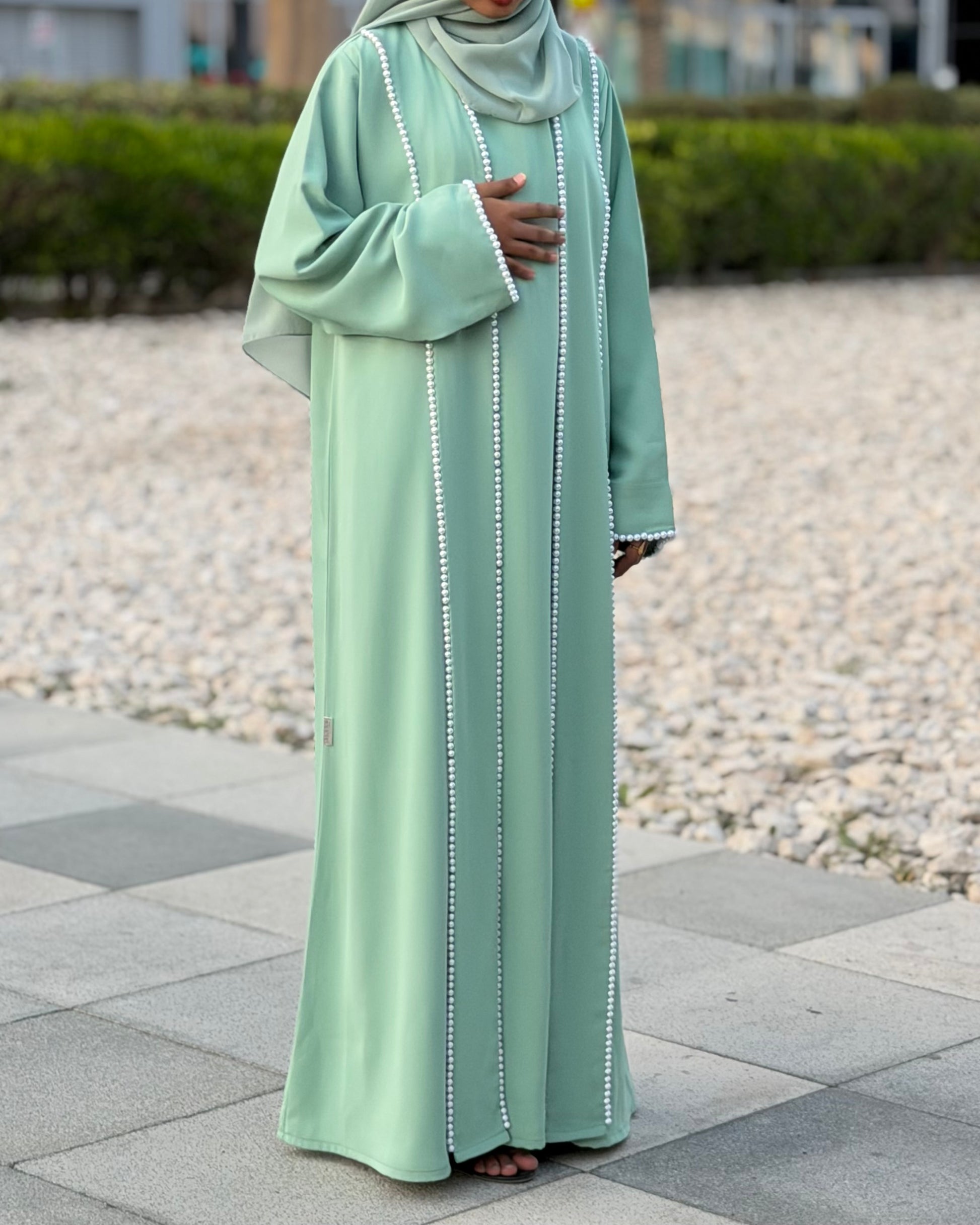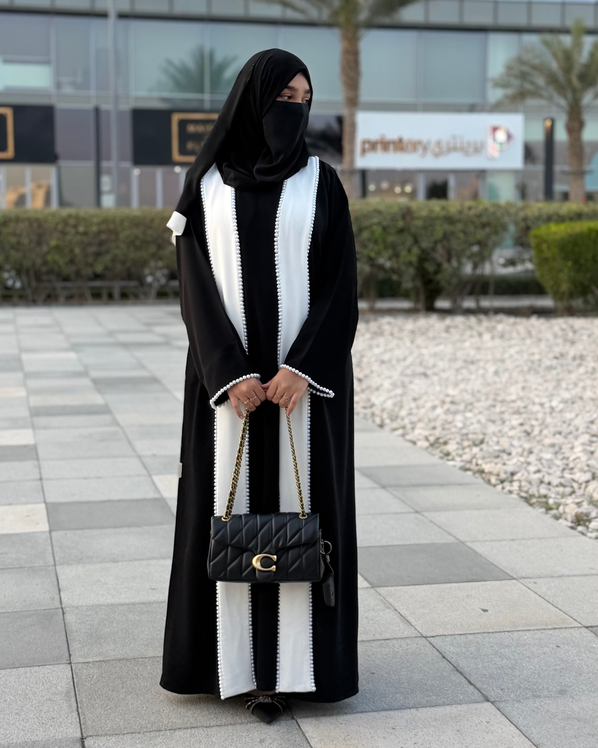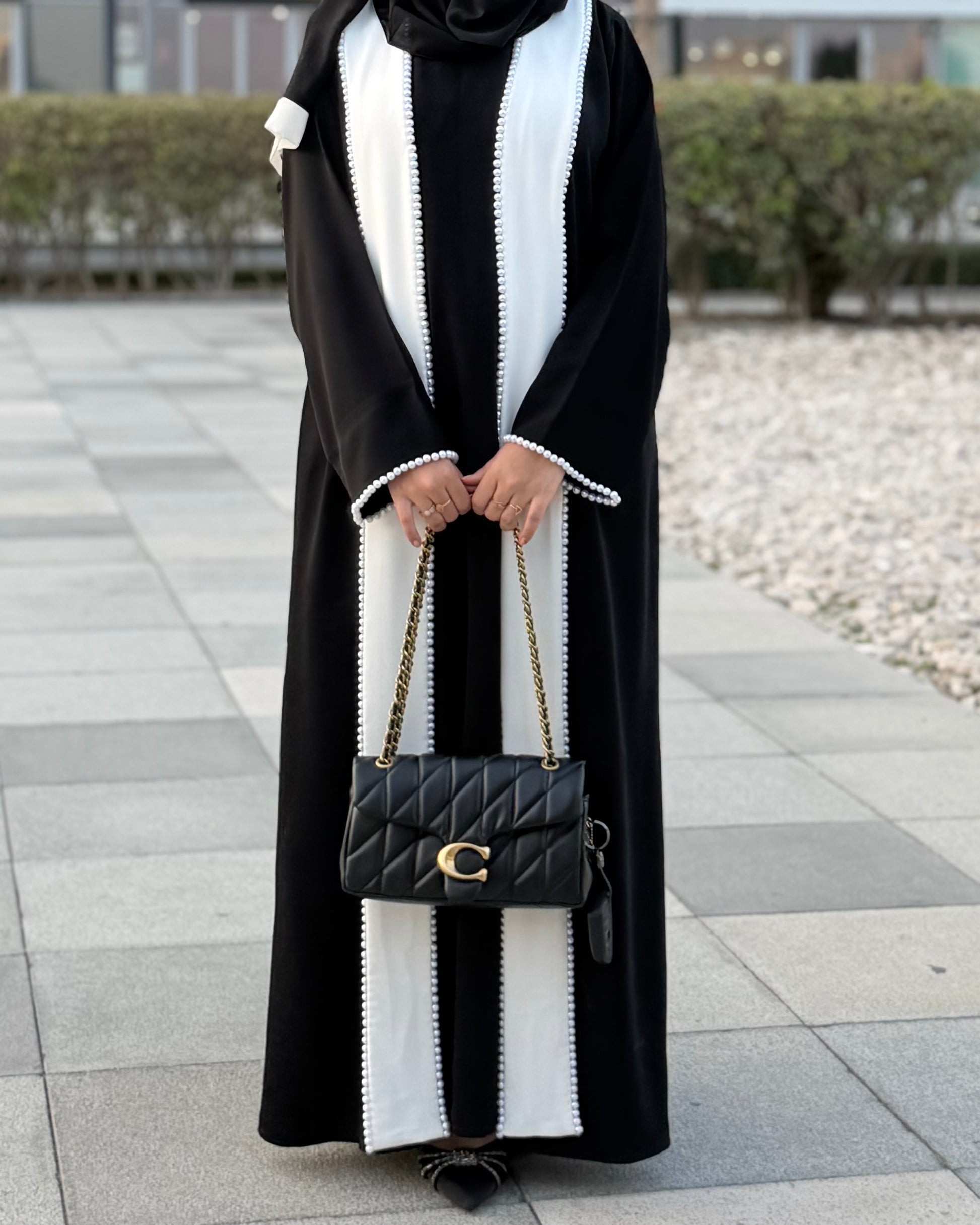 Refined pearl trimming along the front opening and sleeve cuffs. Designed with a vertical contrast panel that elongates the silhouette and adds understated elegance without heavy embellishment.