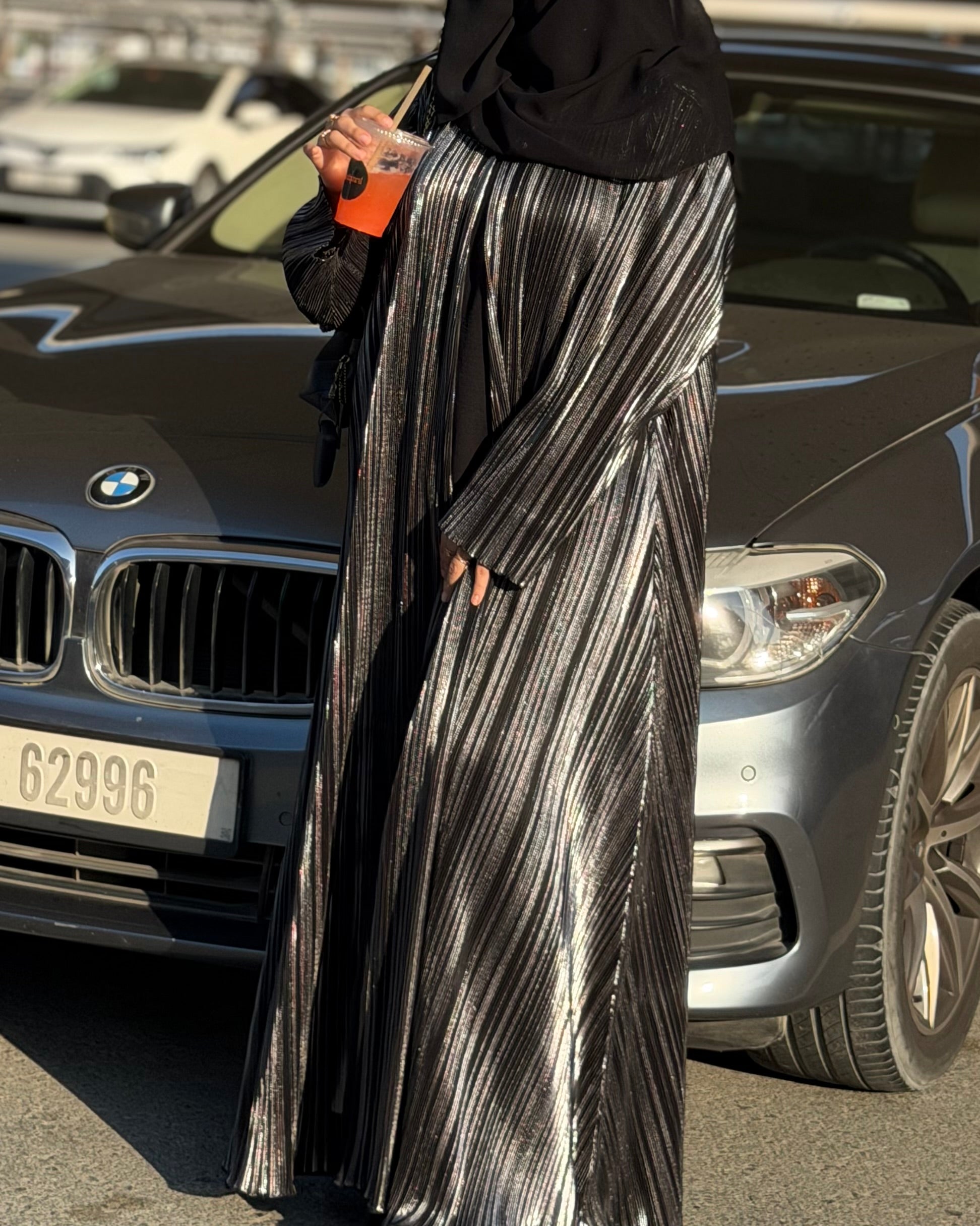Full flowing structure with vertical shimmer pleats that reflect light beautifully. Designed for evening presence and Eid night styling.